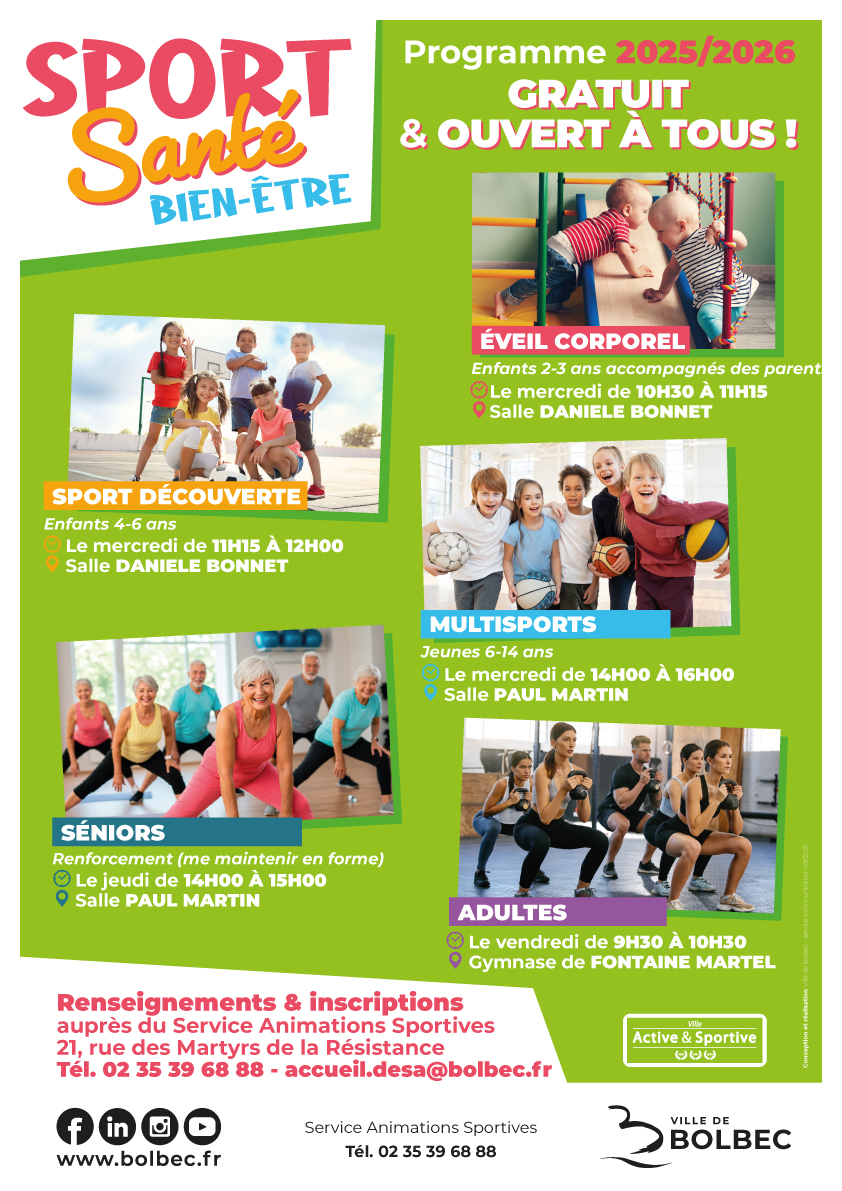 Le service des animations sportives a pour ambition d’amener le plus grand nombre de Bolbécais à pratiquer durablement une activité physique, afin de les accompagner vers une association sportive, en proposant des créneaux adaptés à l’âge avec des objectifs spécifiques à chaque séance.